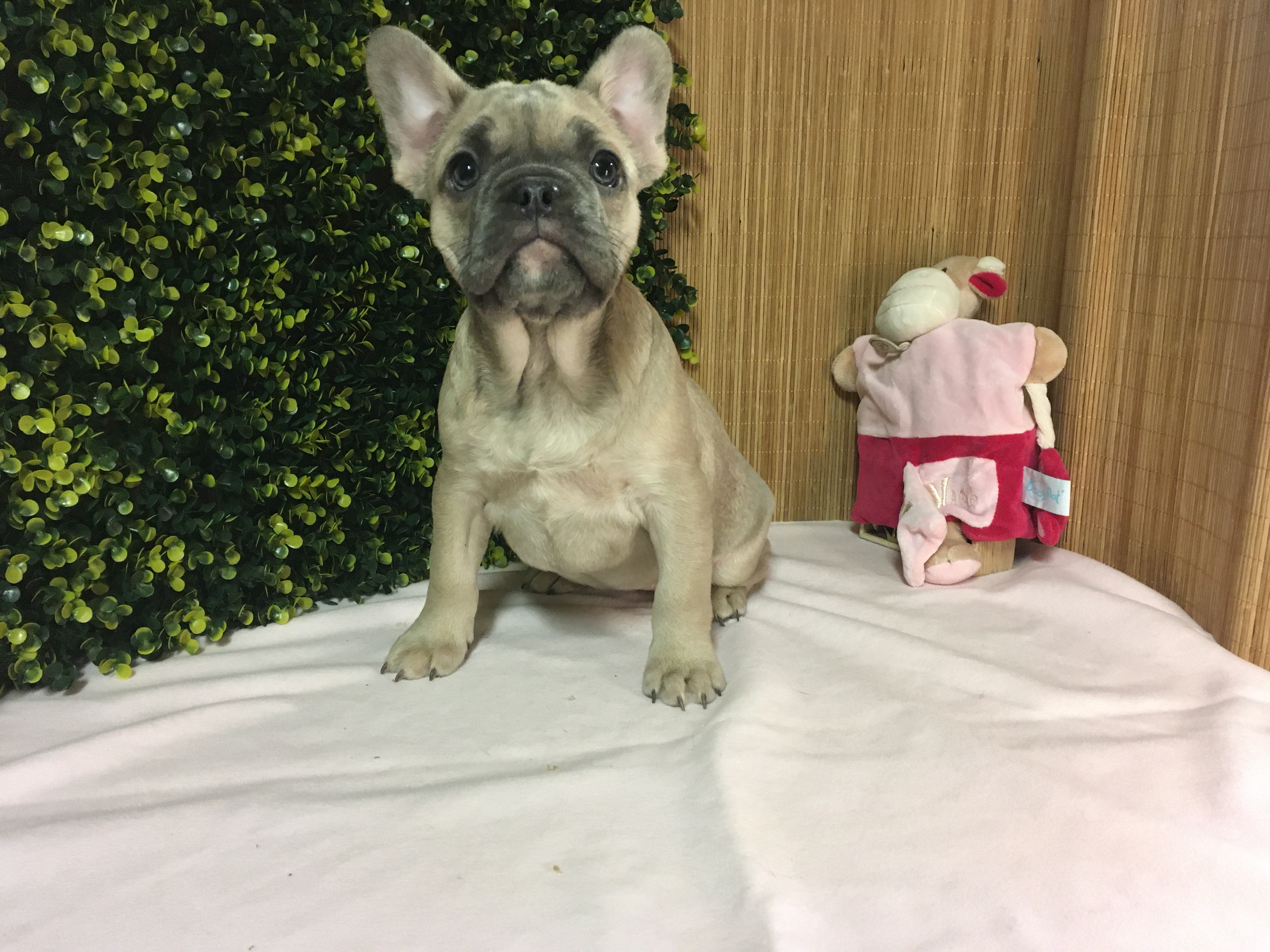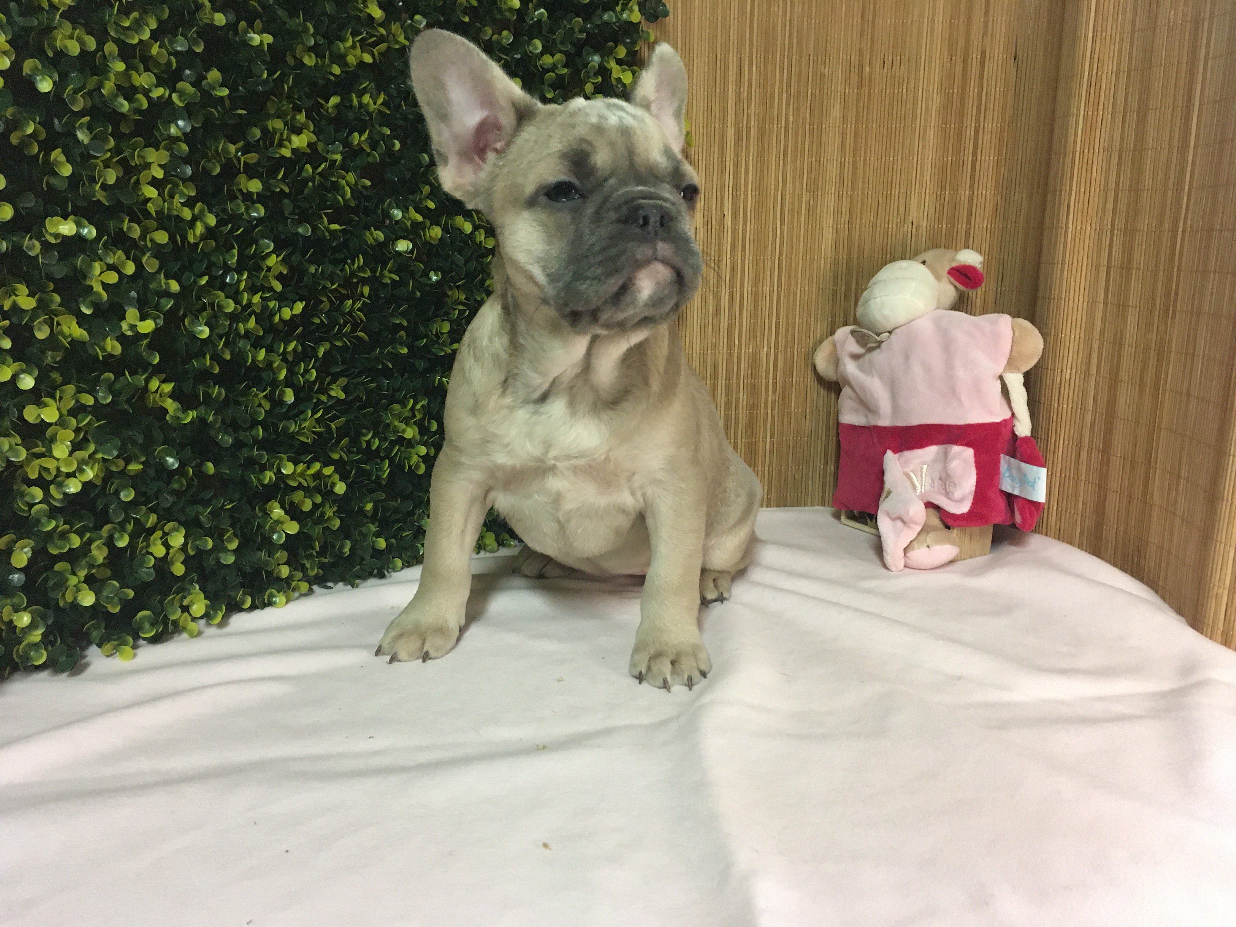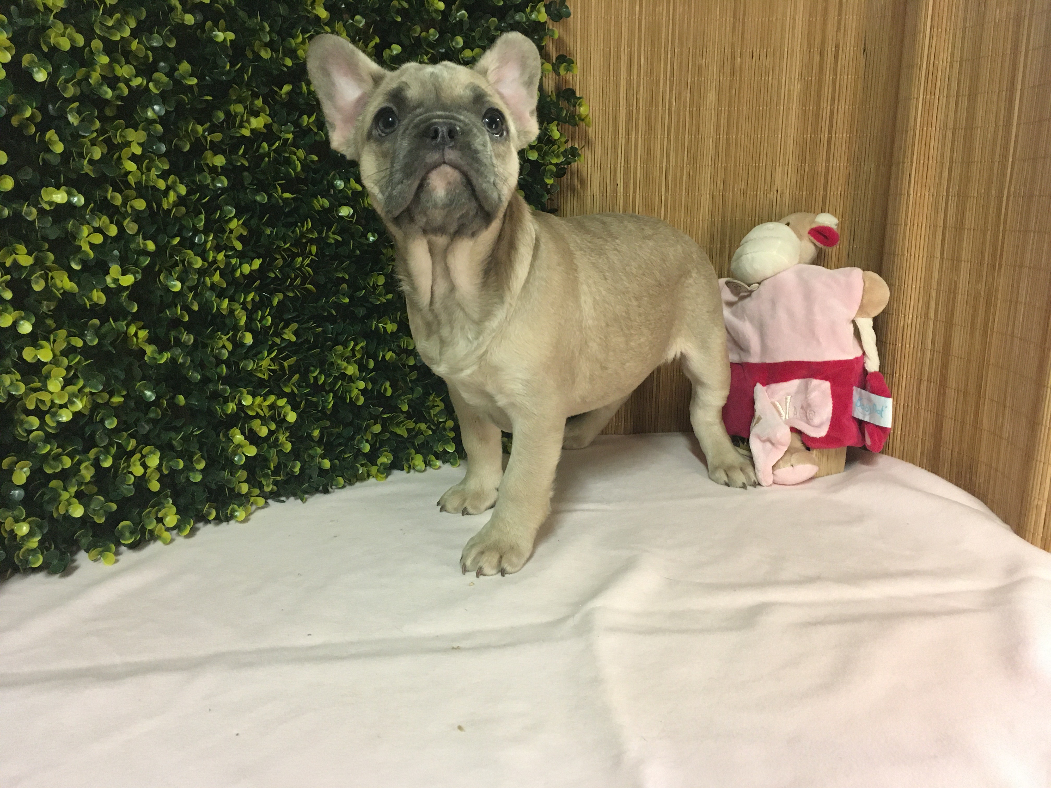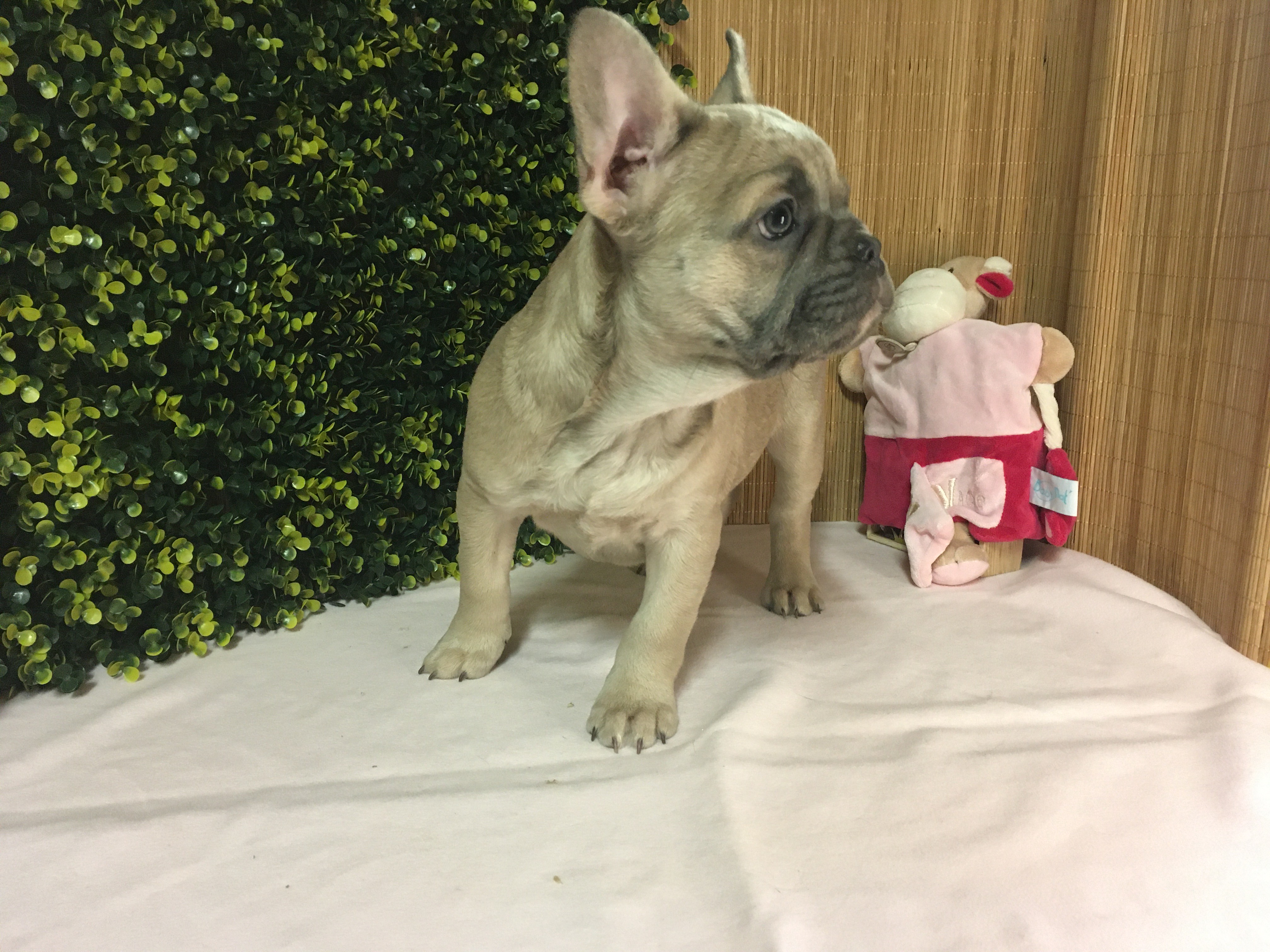 Femelle ALOé Bleu Fawn/Sable en poils courts : De gabarit moyen, elle adore jouer et interagir. Le bouledogue Français typique par excellence.
